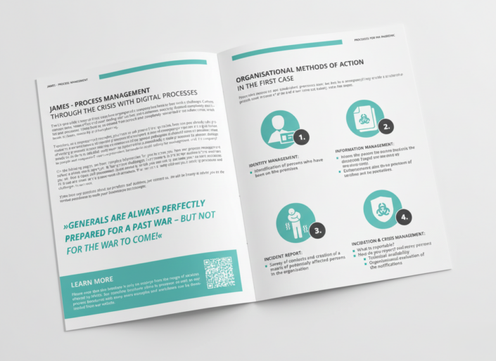 Während der Corona-Pandemie stieg der Bedarf an Lösungen, die Besuchsprozesse vereinfachen, Teilnehmerzahlen messbar machen und Corporate Security garantieren. Für die Softwarelösung der Firma metaSEC entwickelten wir eine Broschüre, die weit über reine Information hinausgeht. Das von uns gestaltete Konzept und Design bietet durch einen Self-Assessment-Fragenkatalog echten Mehrwert: Kunden können ihre Prozesse eigenständig prüfen, Schwachstellen identifizieren und Bedarfe präzise ermitteln.